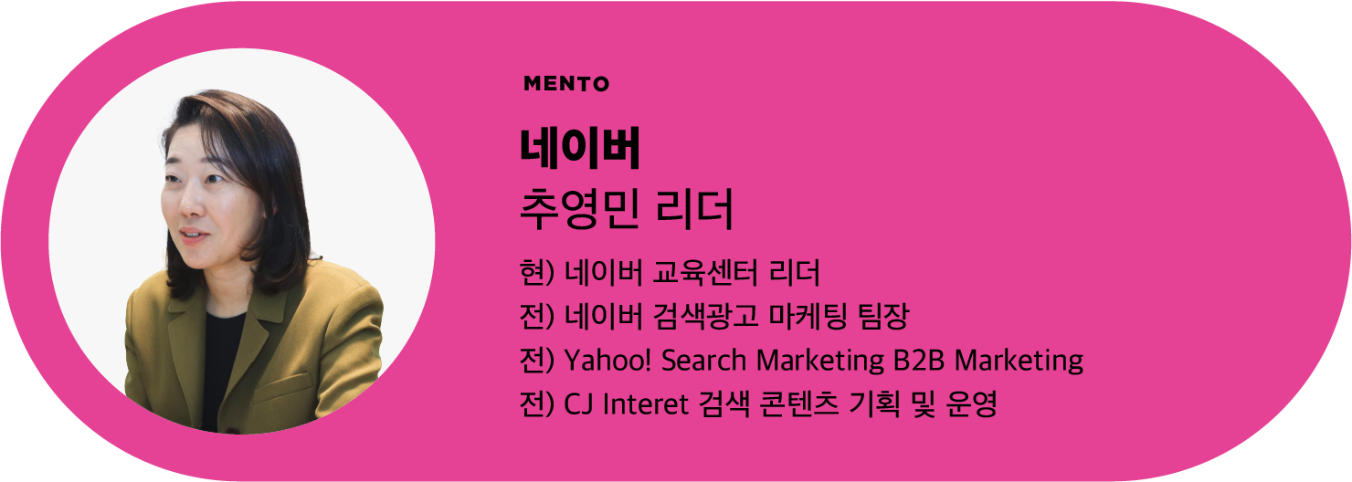 네이버에서는 광고를 직접 운영하고자 하는 광고주들에게 광고 플랫폼에 대한 이해와 활용 전략을 효과적으로 알리는데 특화된 경험을 쌓았고, 현재는 네이버를 통해 비즈니스를 시작하고 성장하고자 하는 다양한 SME(Small and Medium size Enterprises)를 위한 교육과 콘텐츠 마케팅 업무를 수행하고 있습니다.